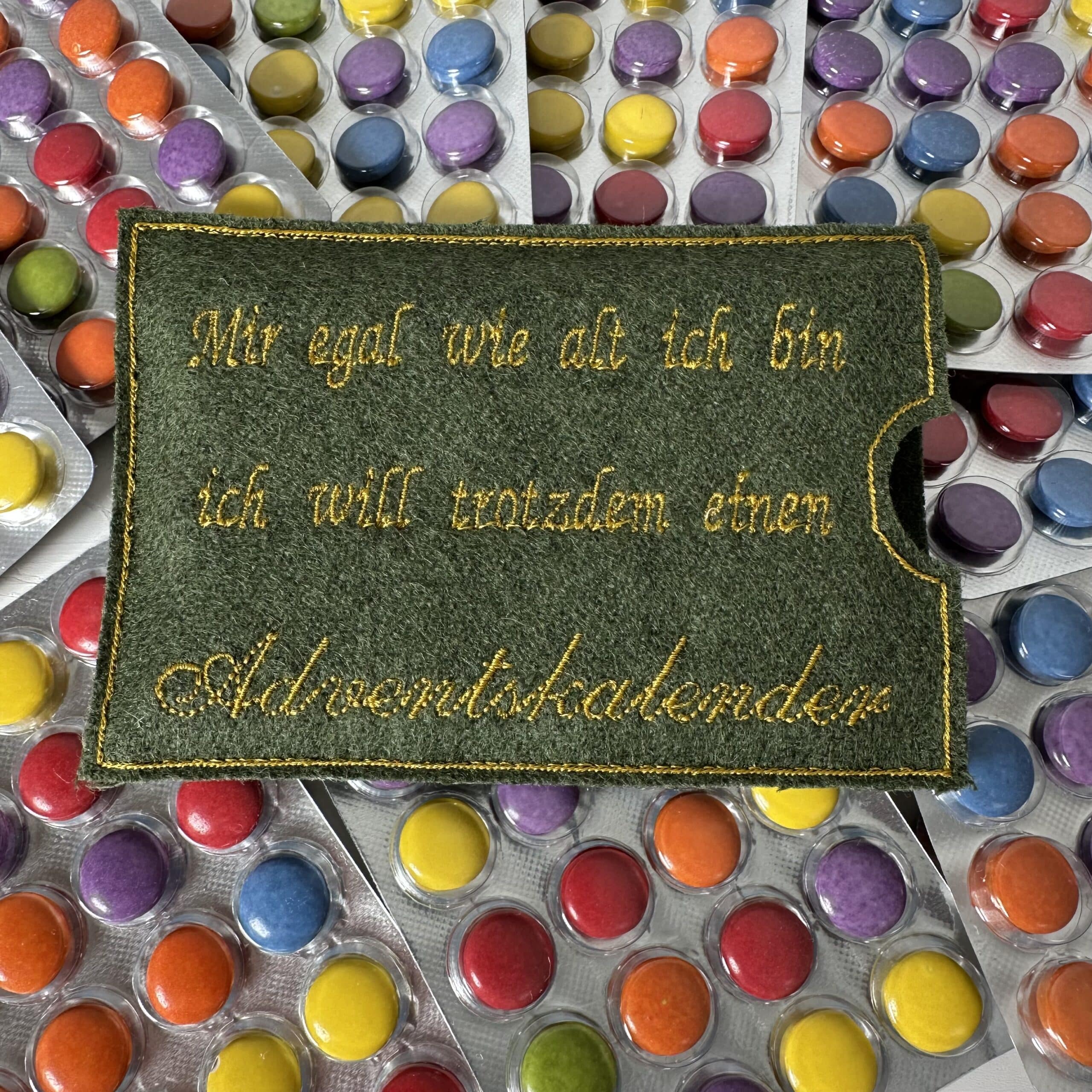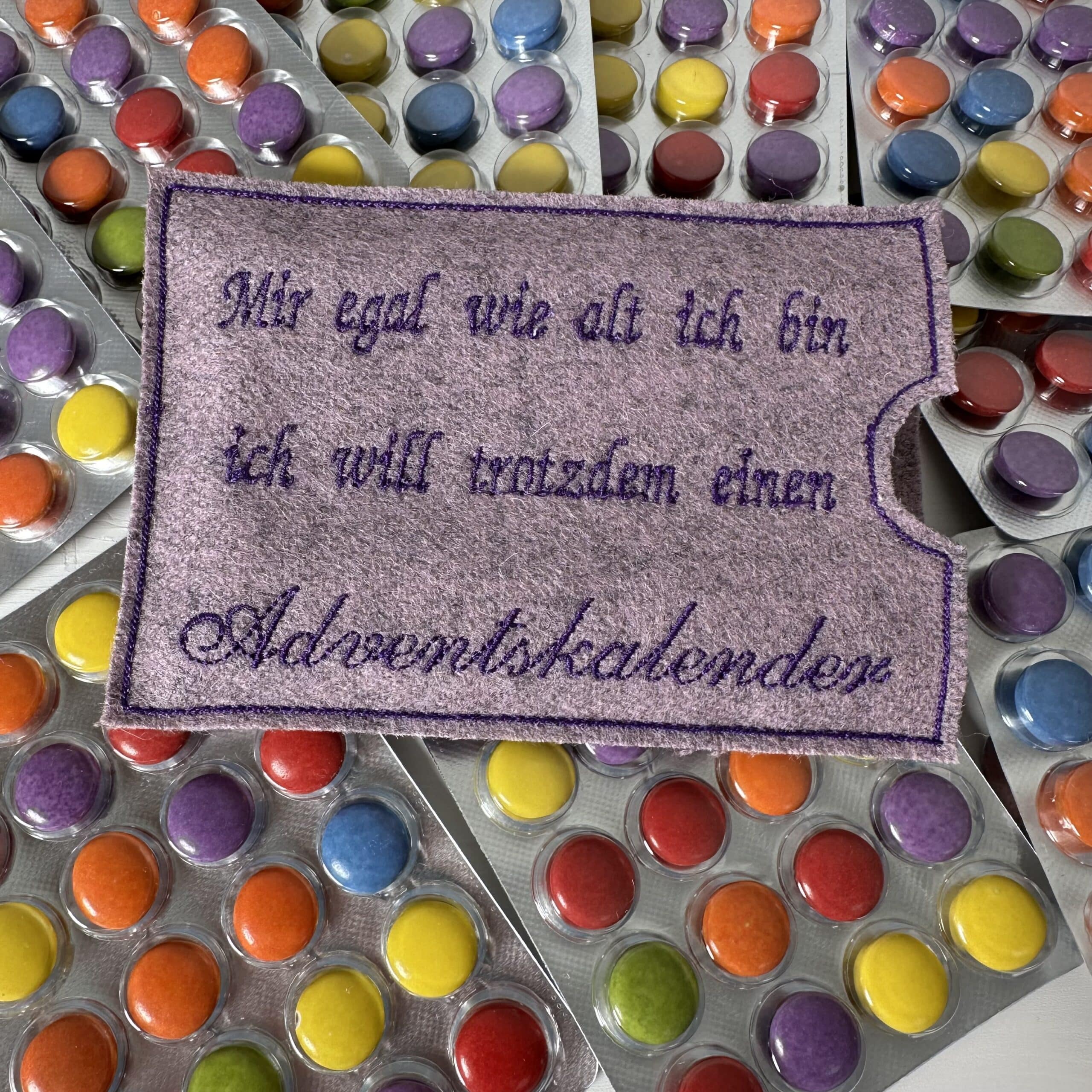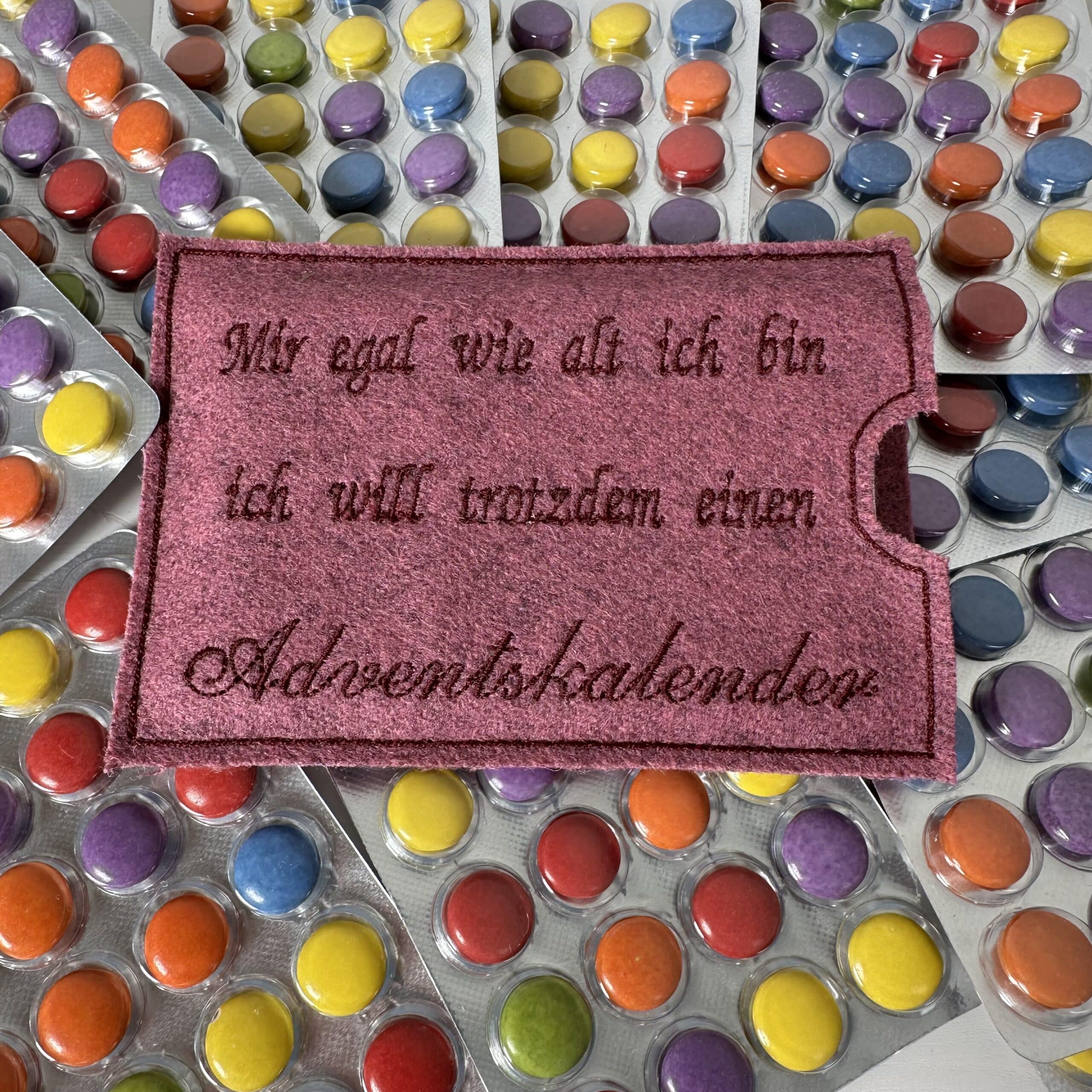 📦 Lieferumfang: 1x bestickte Filzhülle nach Wahl, 1x Blisterverpackung mit 24 dragierten Schokolinsen (Adventskalender)