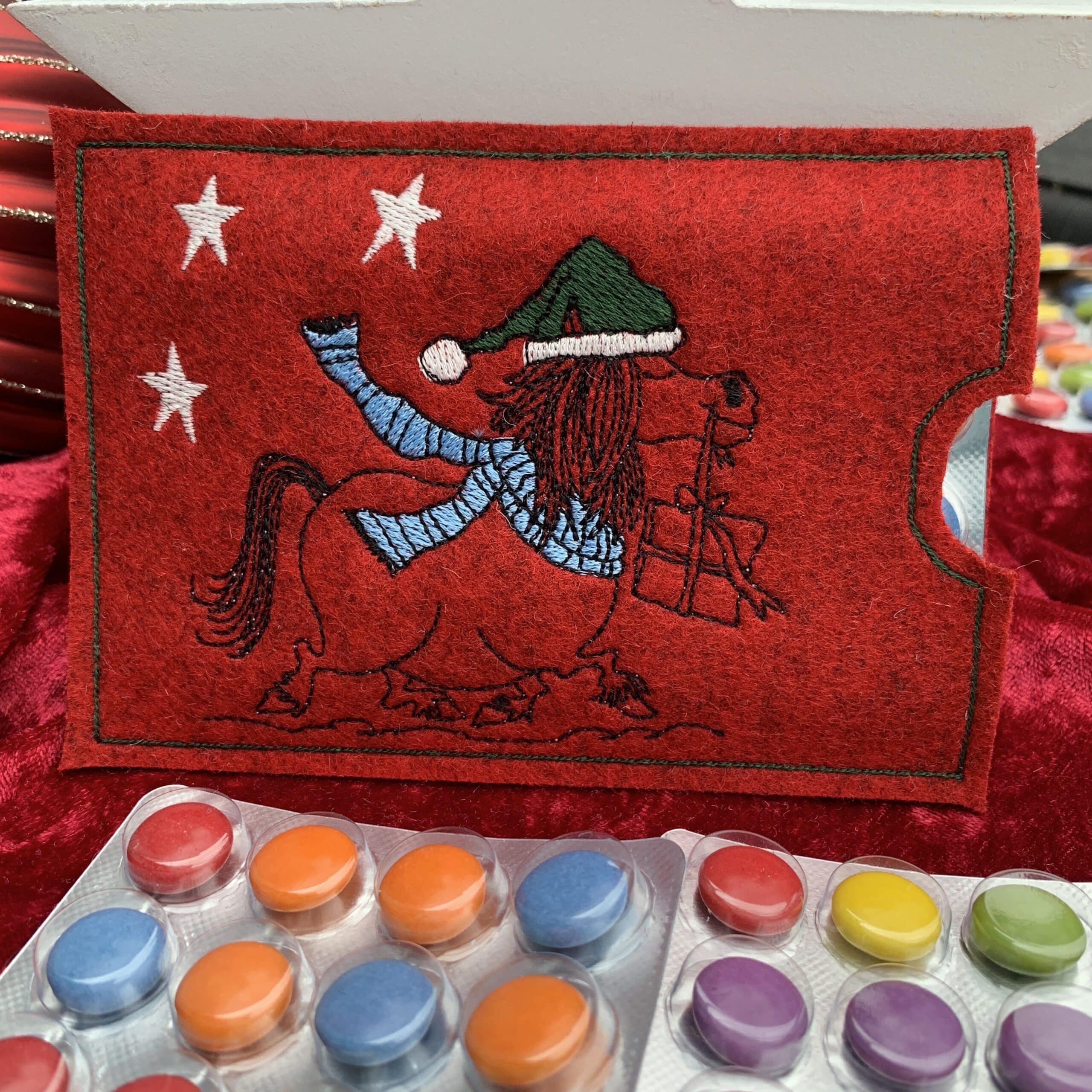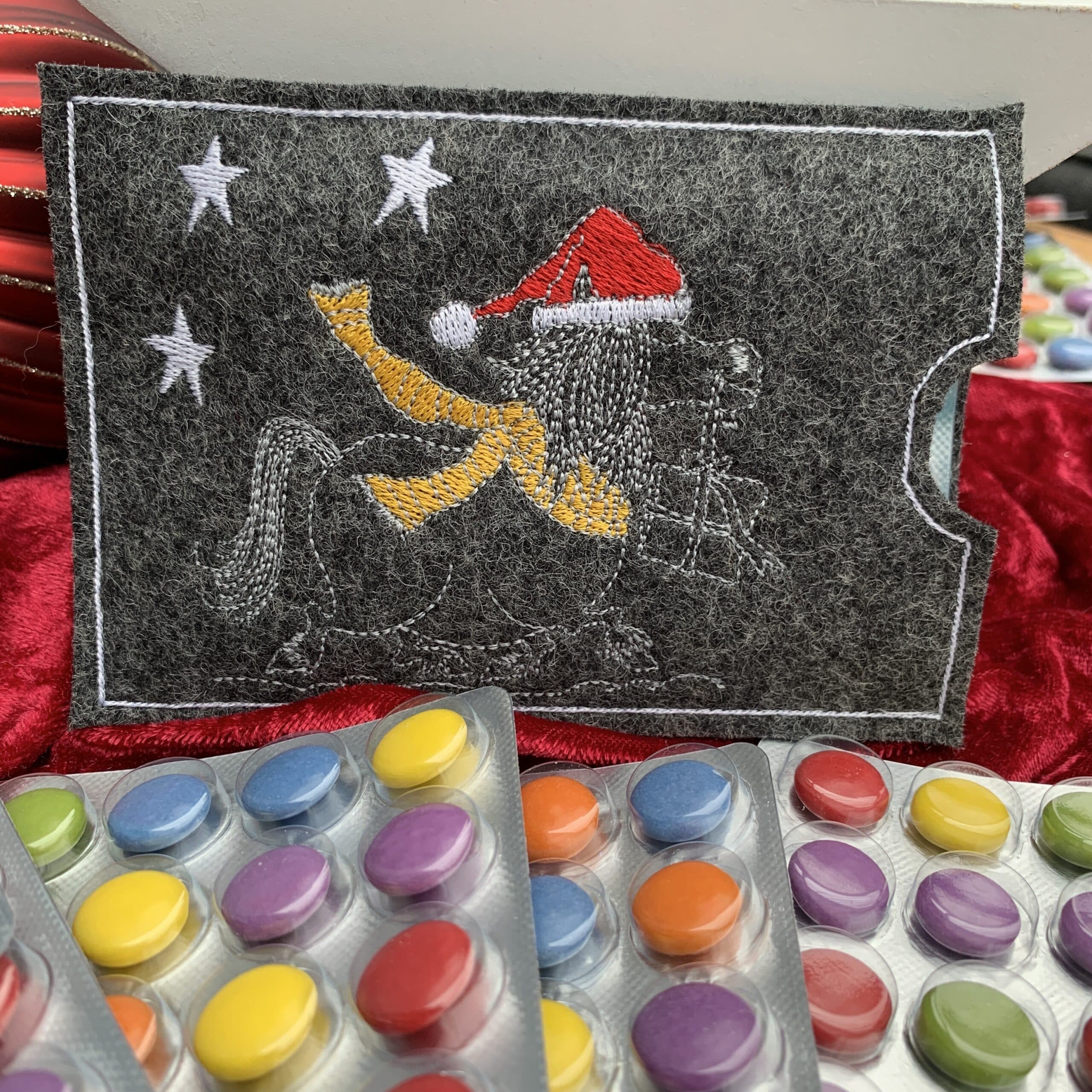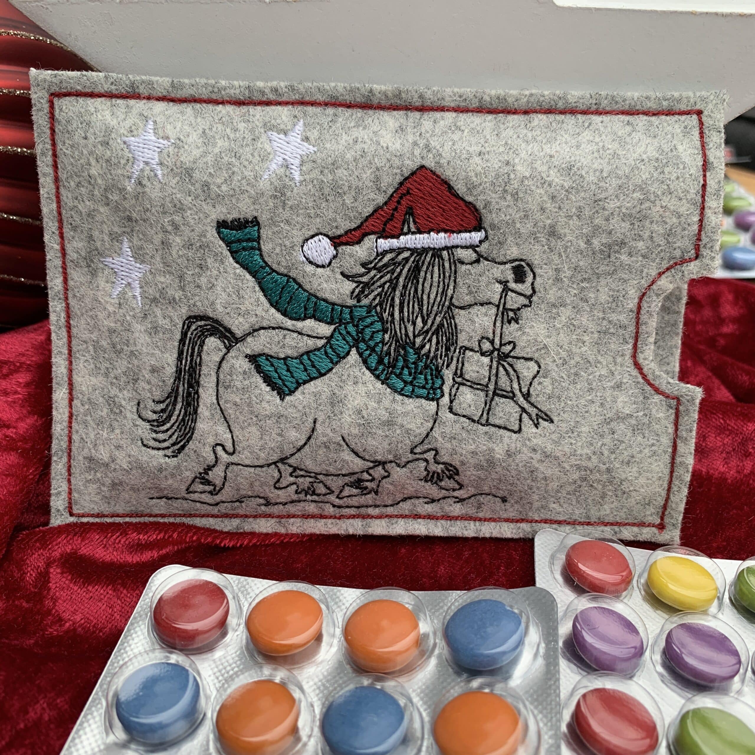 📦 Lieferumfang: 1x bestickte Filzhülle nach Wahl, 1x Blisterverpackung mit 24 dragierten Schokolinsen (Adventskalender)