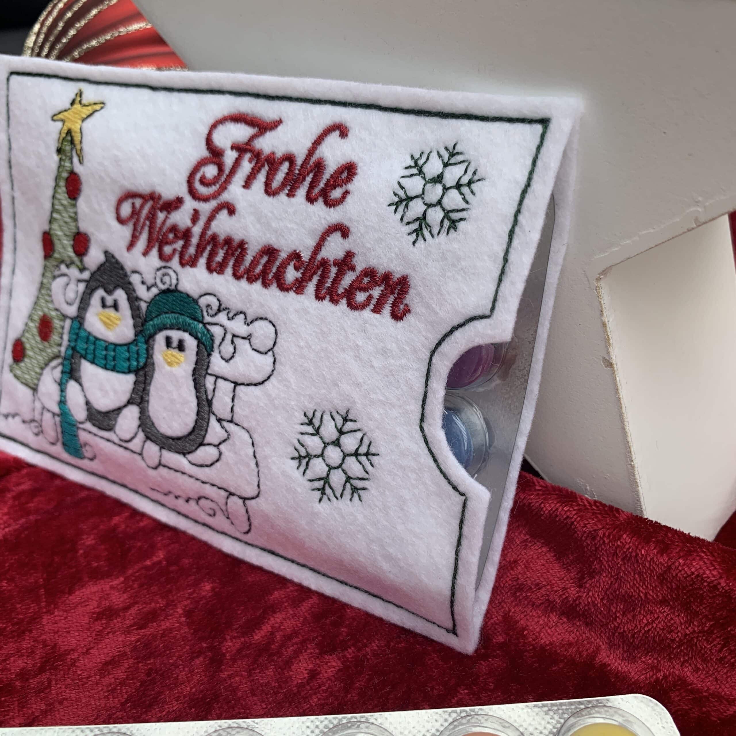 Jede Hülle enthält eine passende Blisterverpackung mit 24 dragierten Schokolinsen (ca. 11 × 8 cm) – für jeden Tag im Advent eine kleine Freude. Die Hüllen sind wiederverwendbar, liebevoll verarbeitet und mit professionellem Stickgarn verziert. Sie eignen sich hervorragend als Wichtelgeschenk, Tischdeko oder als kleines Mitbringsel in der Vorweihnachtszeit.