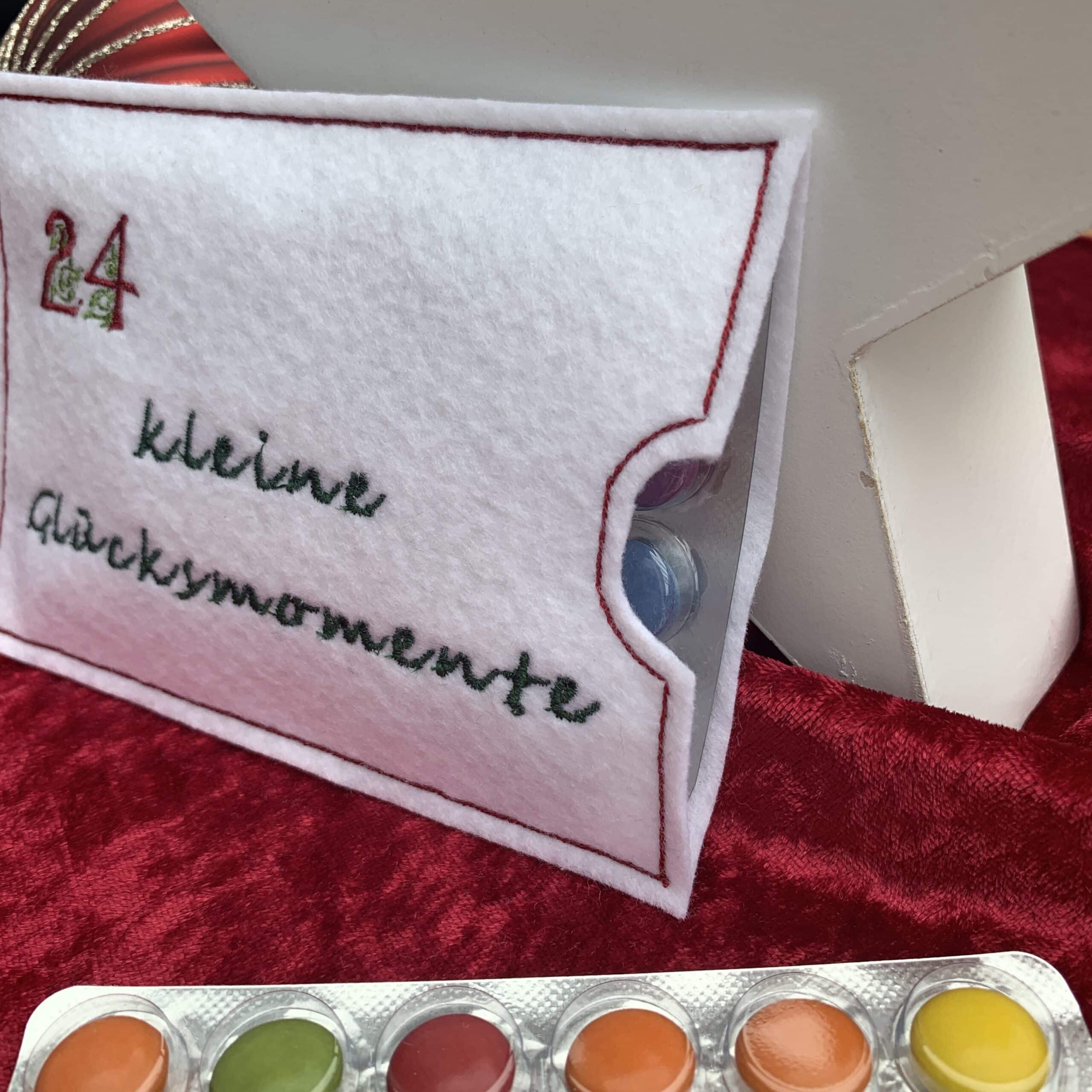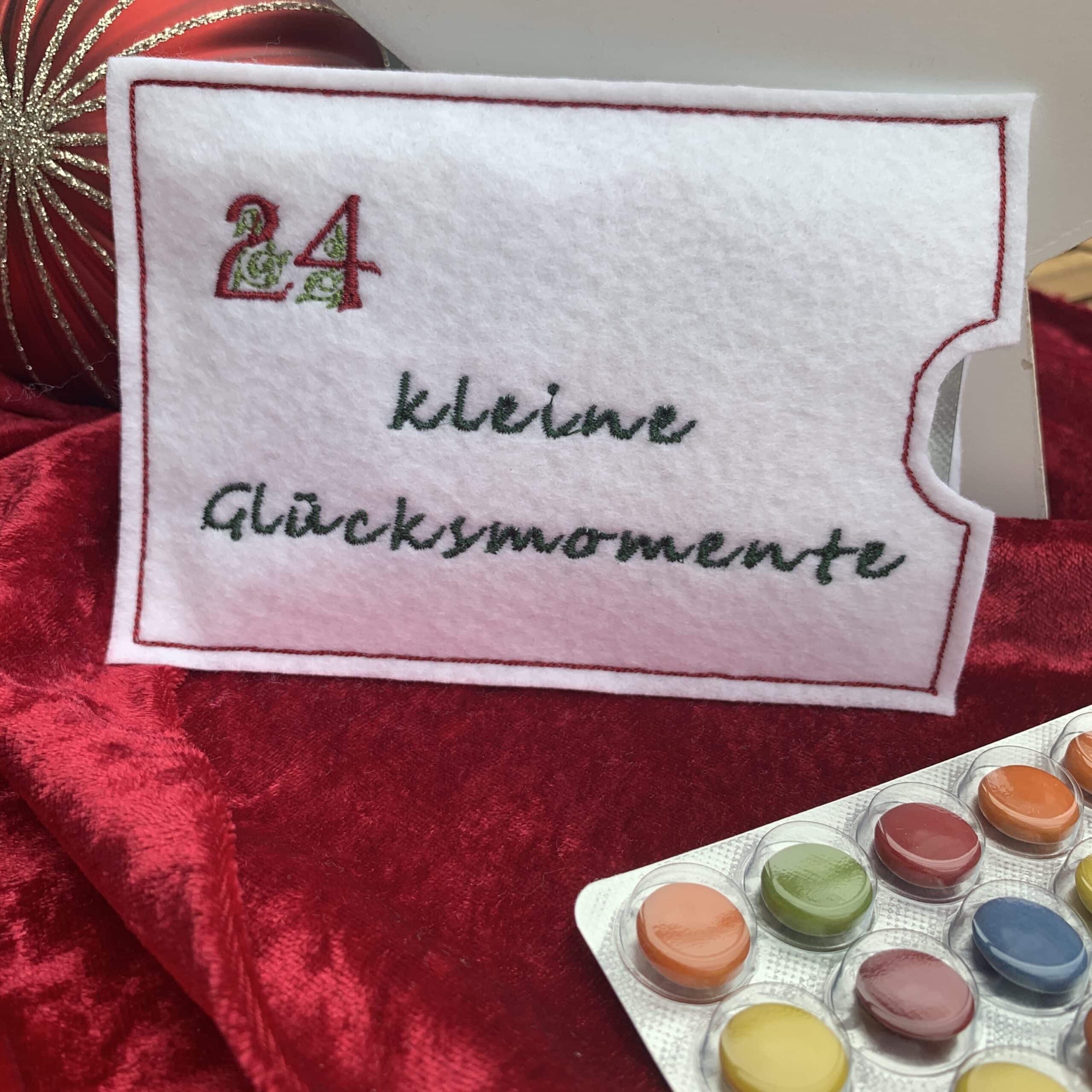 📦 Lieferumfang: 1x bestickte Filzhülle nach Wahl, 1x Blisterverpackung mit 24 dragierten Schokolinsen (Adventskalender)