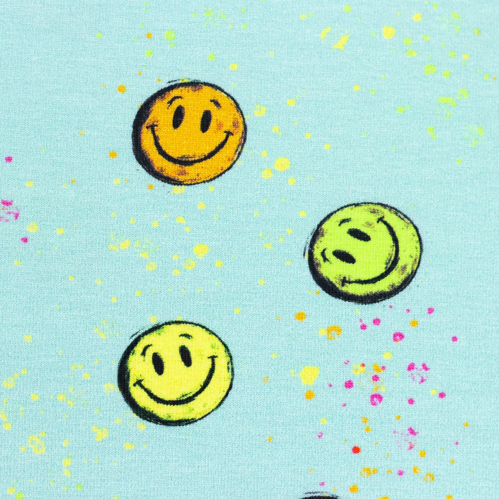 Dieser fröhliche Baumwolljersey „Happy“ von Christiane Zielinski bringt sofort gute Laune ins Nähzimmer. Auf einem sanften mintfarbenen Hintergrund verteilen sich bunte Smiley-Gesichter in Gelb, Pink und Neon-Grün, ergänzt durch feine Farbspritzer im Graffiti-Stil. Das Design wirkt modern, verspielt und zugleich harmonisch – perfekt für kreative Projekte mit einem Hauch Retro-Charme.