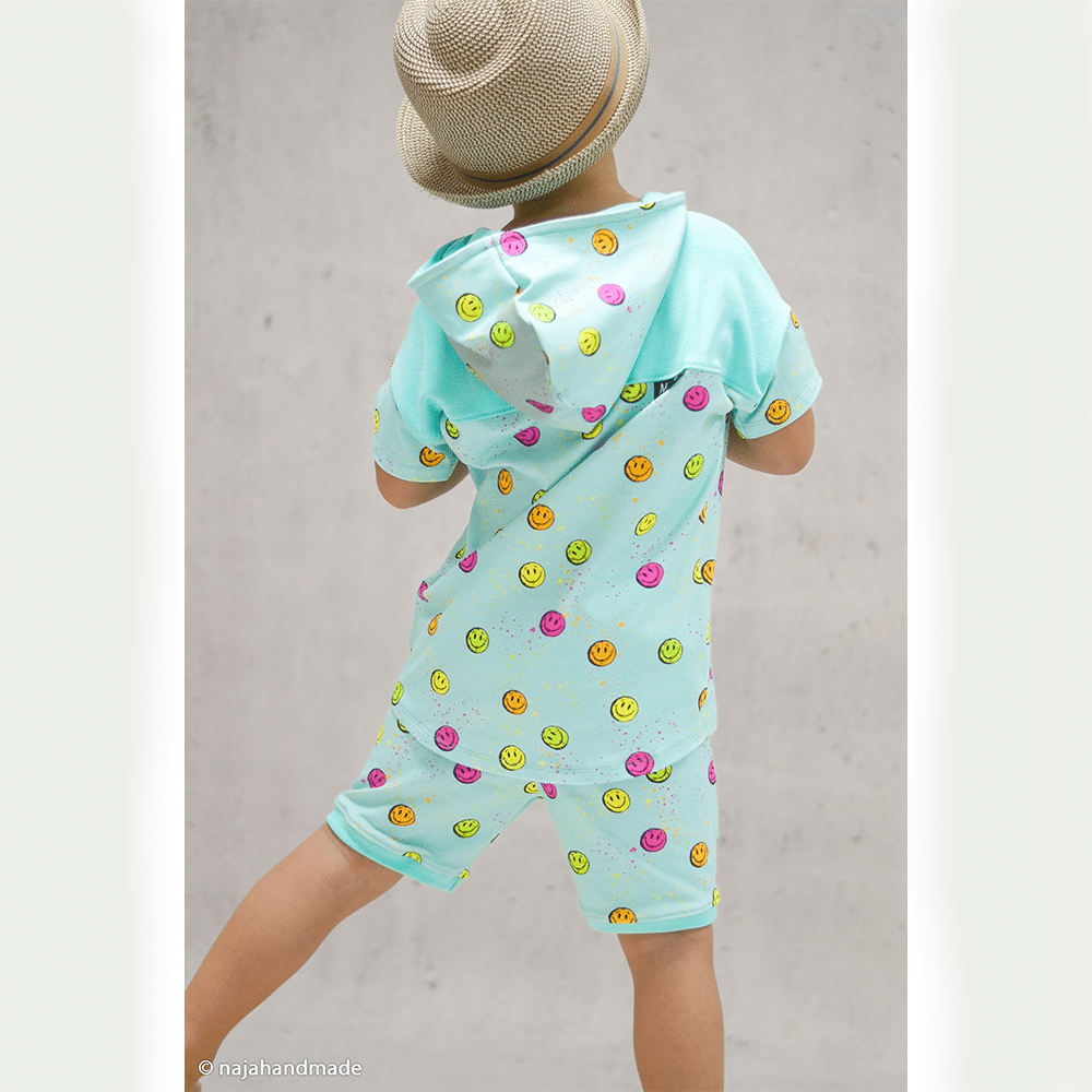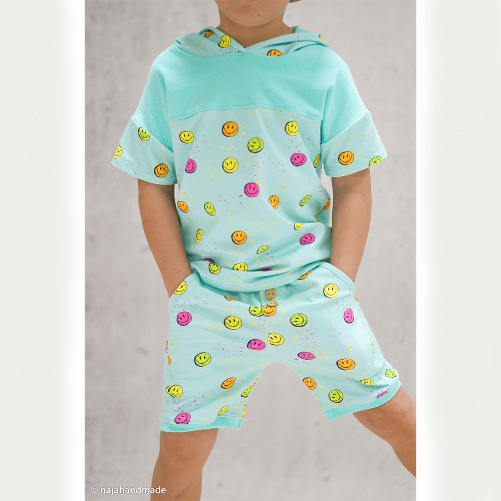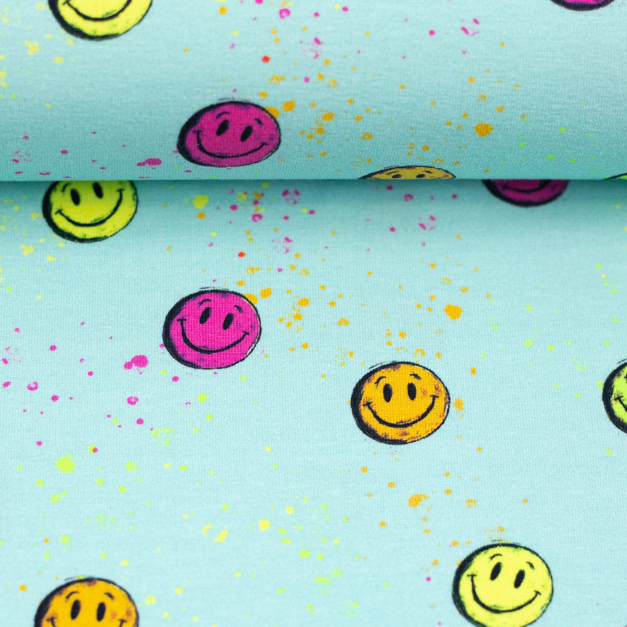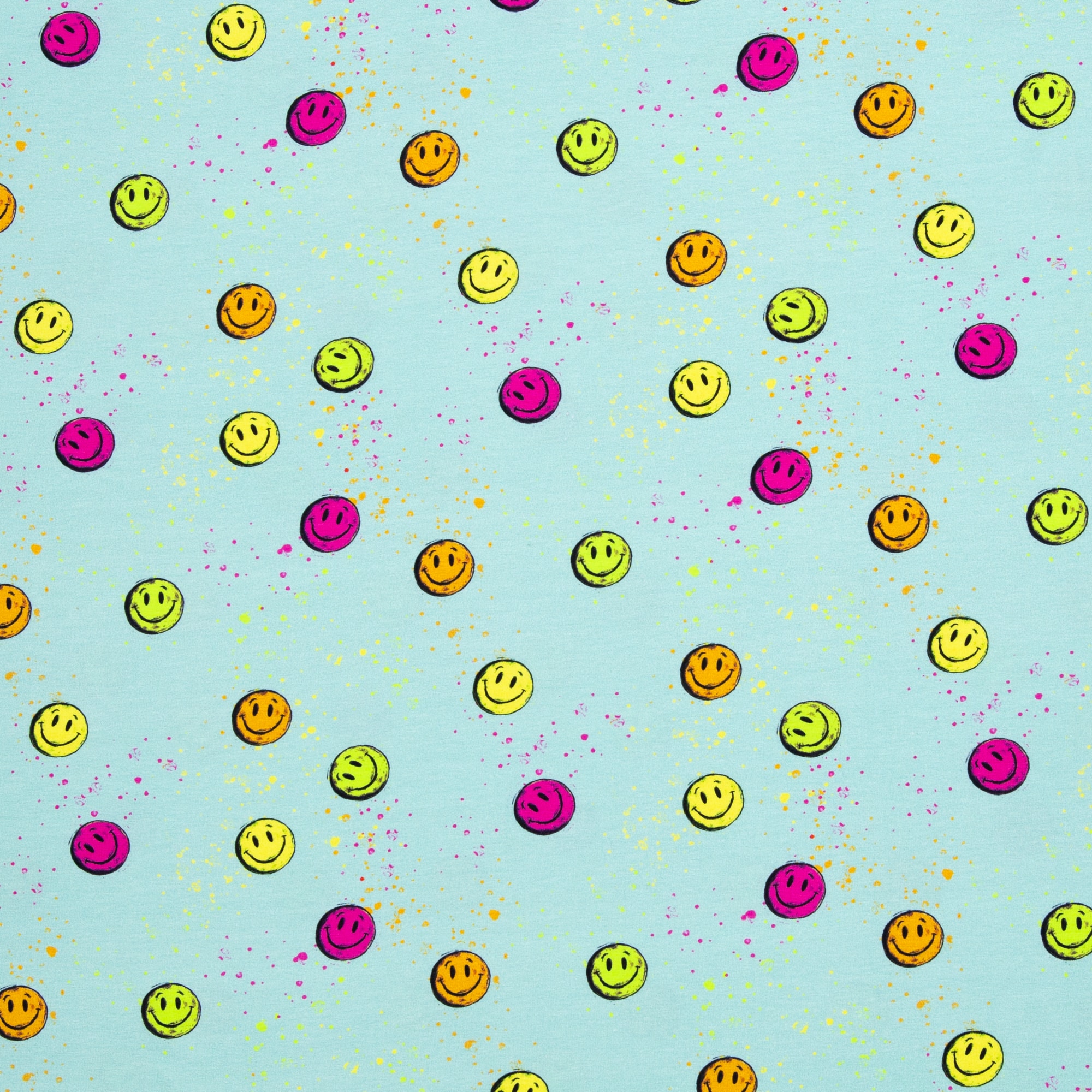 Ob Shirts, Hoodies, Kleider, Leggings, Schlafanzüge, Beanies oder Loops – dieser Baumwolljersey ist vielseitig einsetzbar und sowohl für Kinder- als auch für Erwachsenenmode bestens geeignet. Auch für Accessoires wie Stirnbänder, Mützen oder leichte Decken ist er eine tolle Wahl. Das lebendige Smiley-Design lässt sich sehr gut mit Uni-Stoffen, Neon-Bündchen oder schlichten Basics kombinieren und setzt dabei immer einen fröhlichen Akzent.