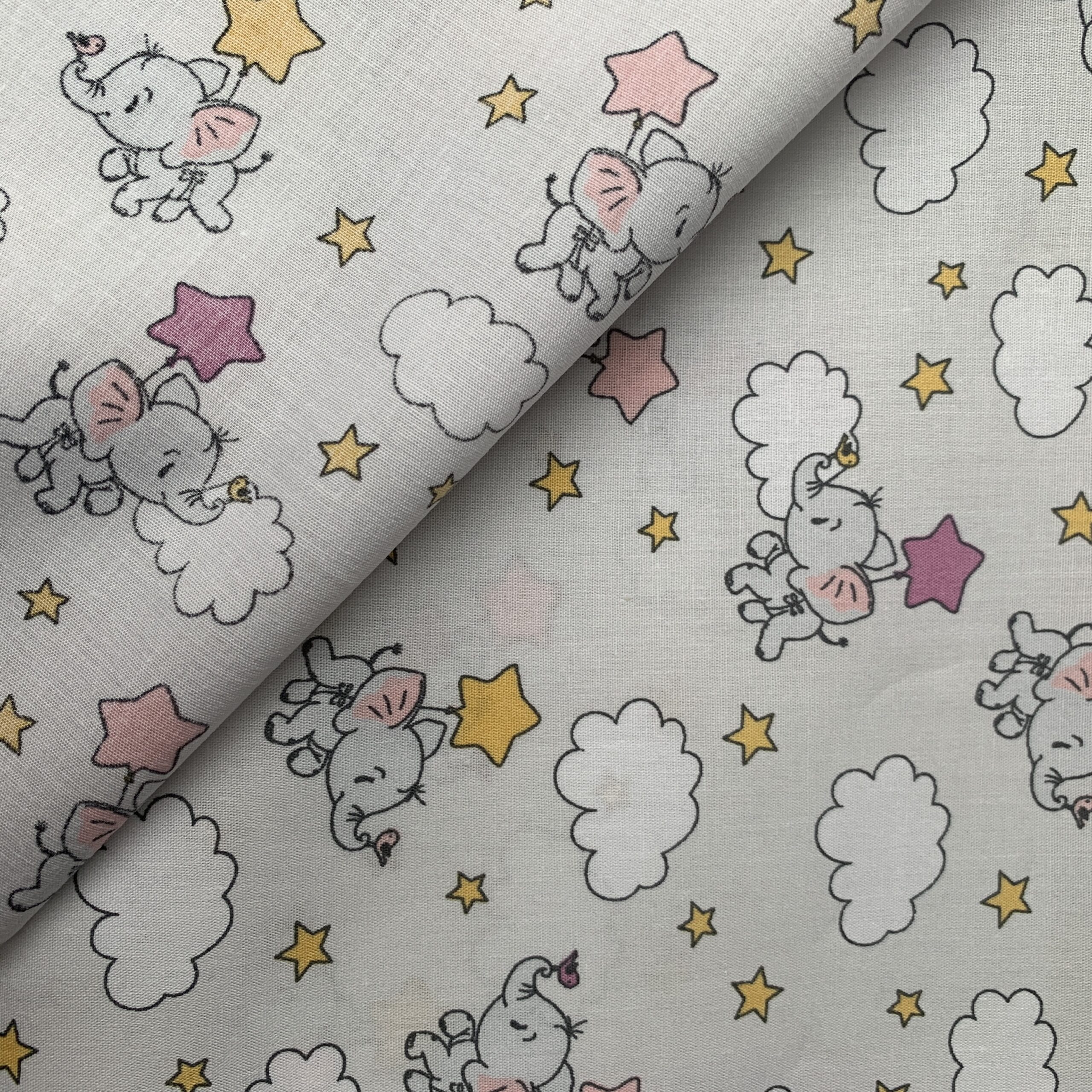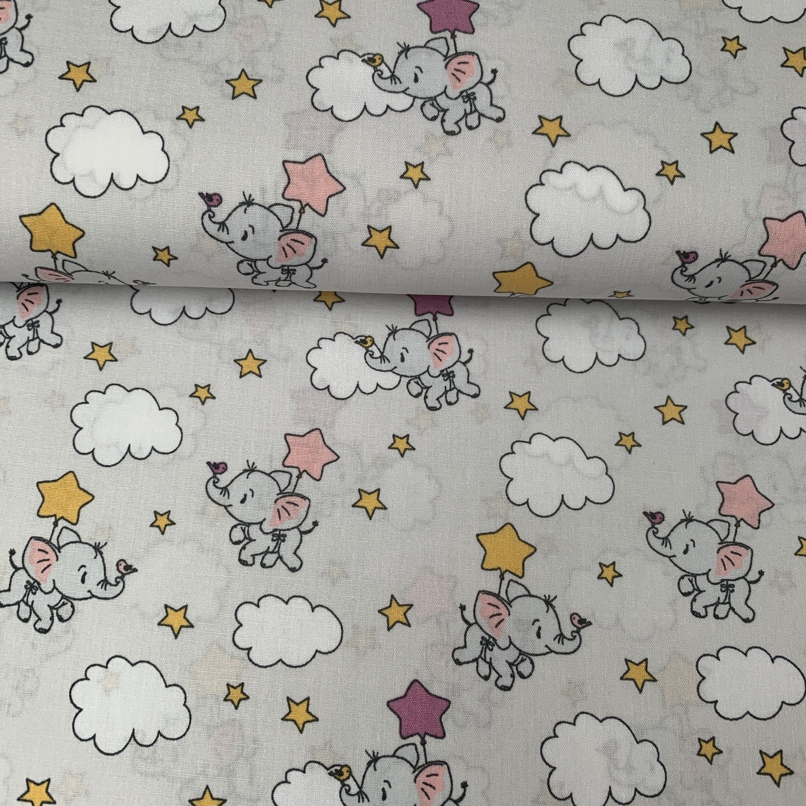 Baumwollstoff Elefanten grau | Tierischer Druckstoff für Baby & Kinder | Wolken & Sterne | Meterware