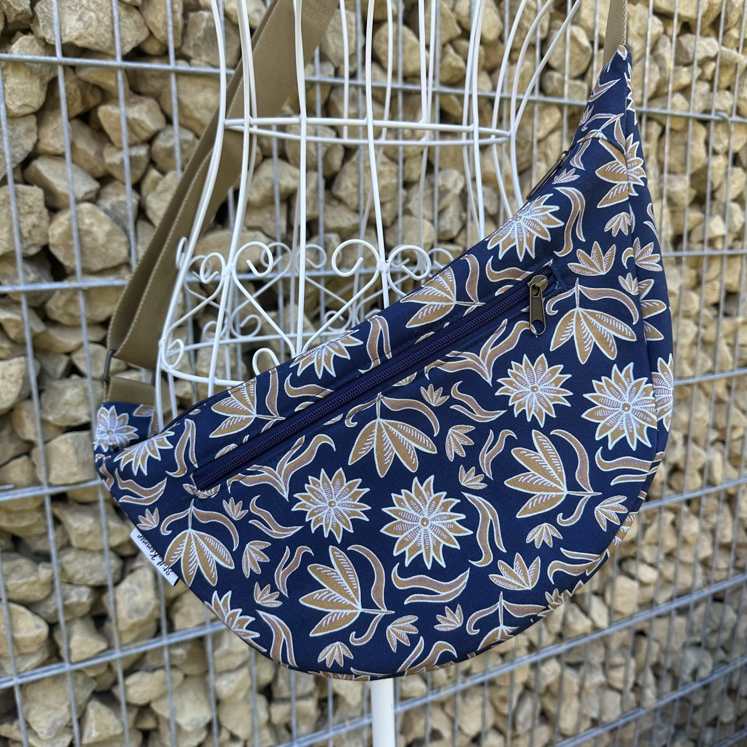 Diese Halbmondtasche in Größe M wurde nach dem Schnittmuster Moon Bag Luna von creaResa (Lizenznummer 19 12690) sorgfältig und mit viel Liebe genäht. Außen kommt robuster Canvas „Retro Flowers“ by Emjo Design (100 % Baumwolle) in Blau mit floralen Mustern zum Einsatz, während das Innenfutter aus Uni-Canvas „Calvin“ in Dunkelblau (100 % Baumwolle) gearbeitet ist.