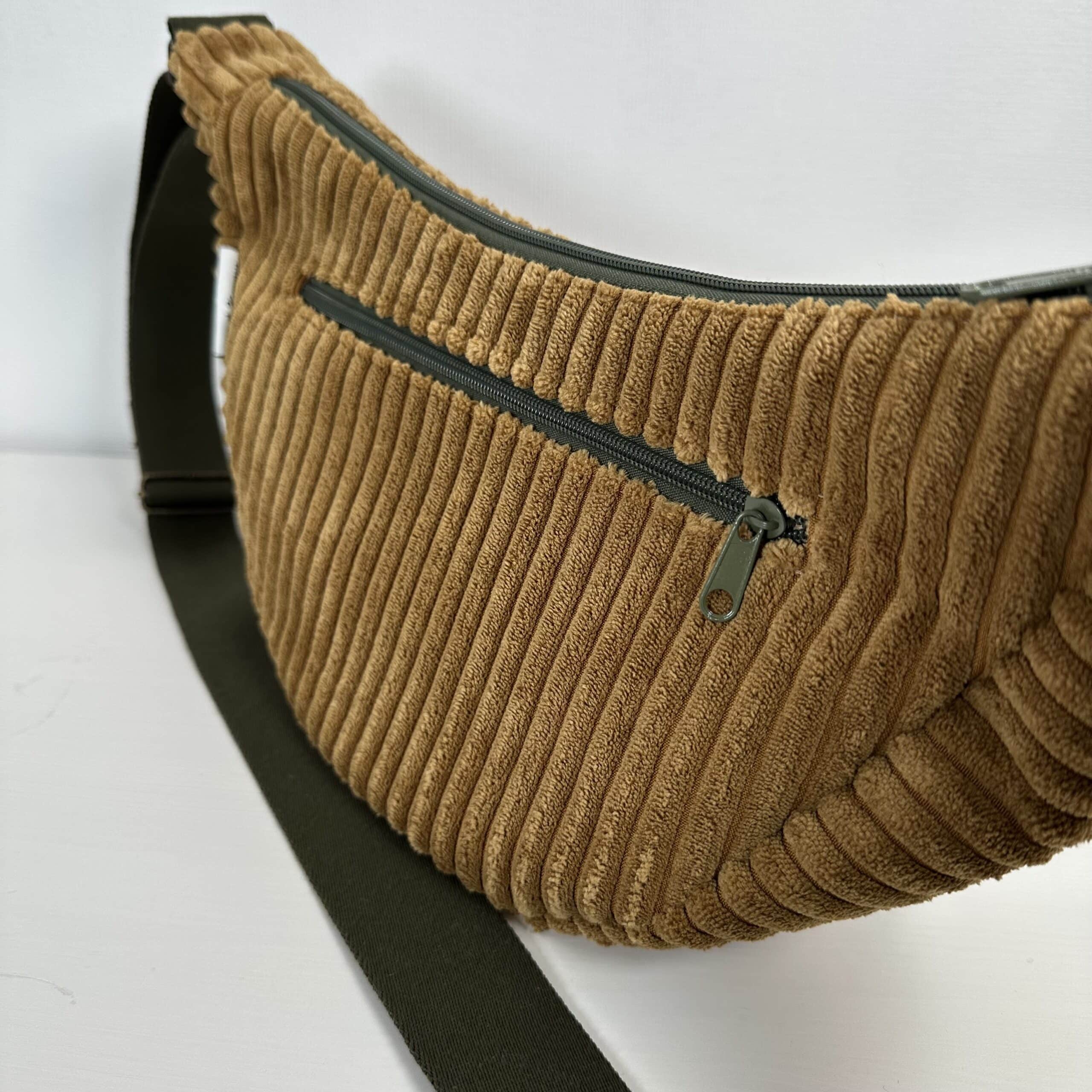 Diese Moon Bag Luna Schultertasche in Größe M wurde nach dem Schnittmuster Moon Bag Luna von creaResa (Lizenznummer 19 12690) sorgfältig und mit viel Liebe genäht. Außen kommt edler Cordstoff Wanja“ in Goldgelb (100 % Polyester) zum Einsatz, während das Innenfutter aus Baumwollstoff (100 % Baumwolle) in Ocker / Creme mit Rautenmuster gearbeitet ist.