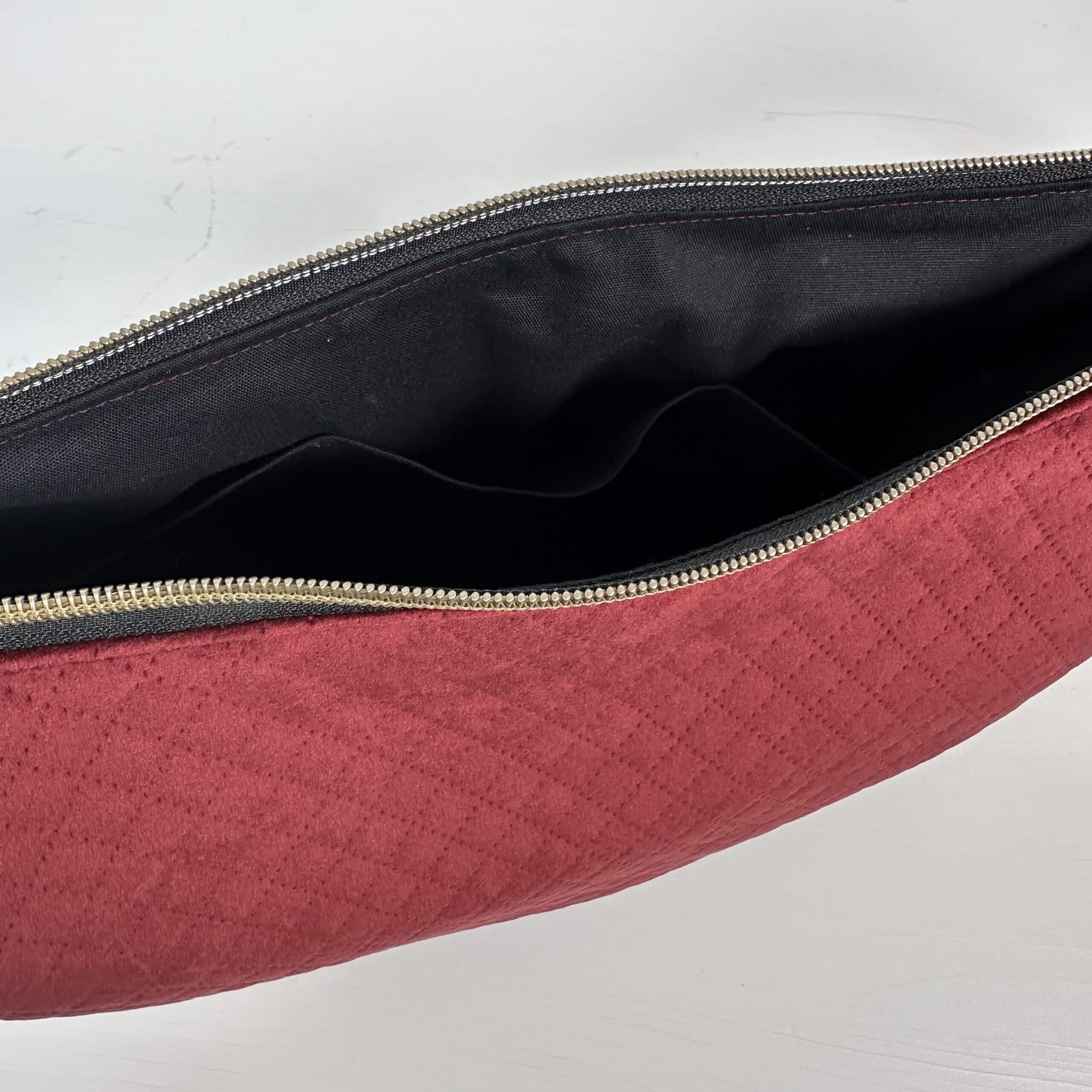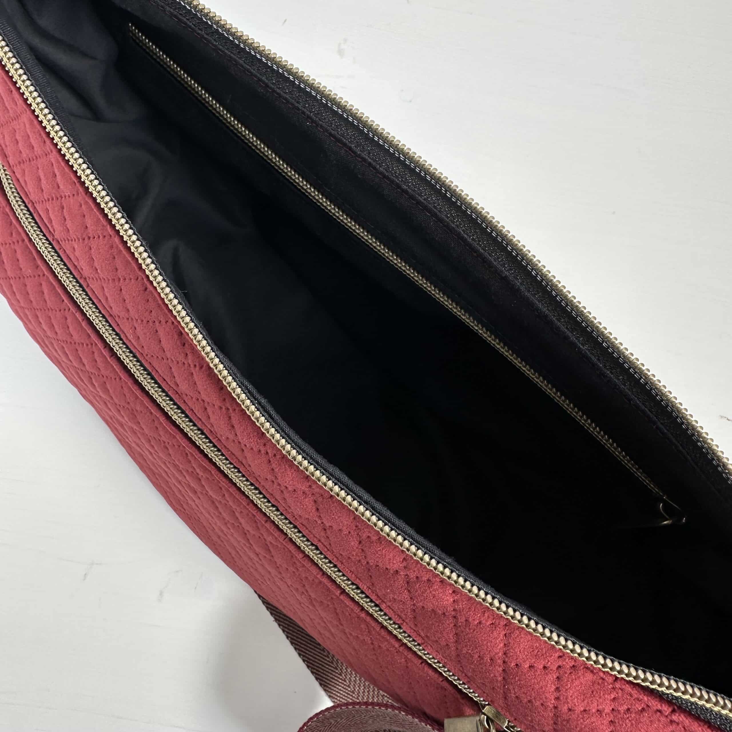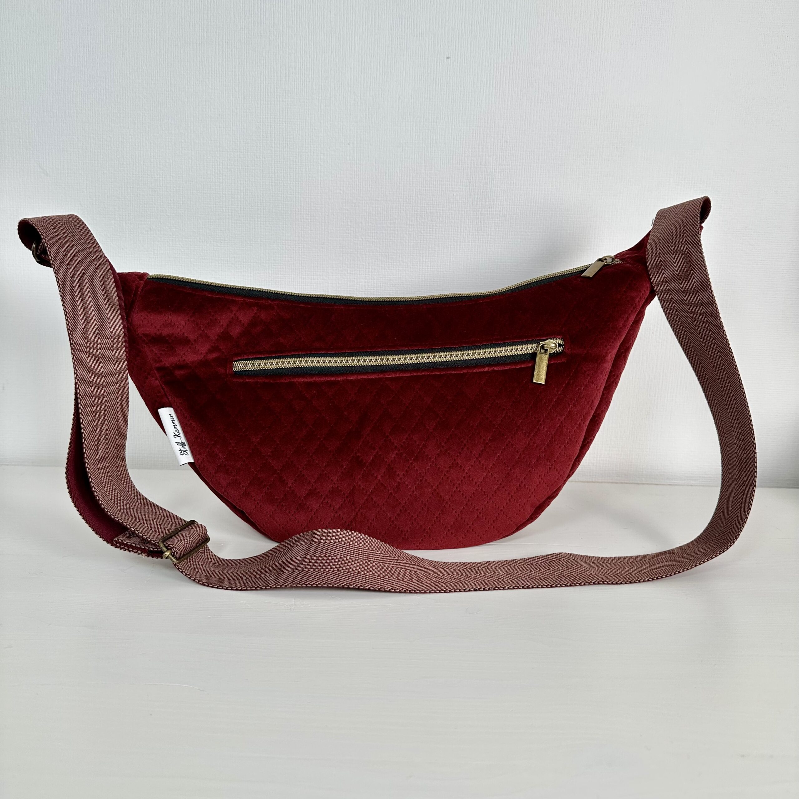 Diese Moon Bag Luna Schultertasche in Größe M wurde nach dem Schnittmuster Moon Bag Luna von creaResa (Lizenznummer 19 12690) sorgfältig und mit viel Liebe genäht. Außen kommt edler Samtstepper Tokio in Rot (100 % Polyester) zum Einsatz, während das Innenfutter aus Baumwollstoff (100 % Baumwolle) in UNI Schwarz gearbeitet ist.