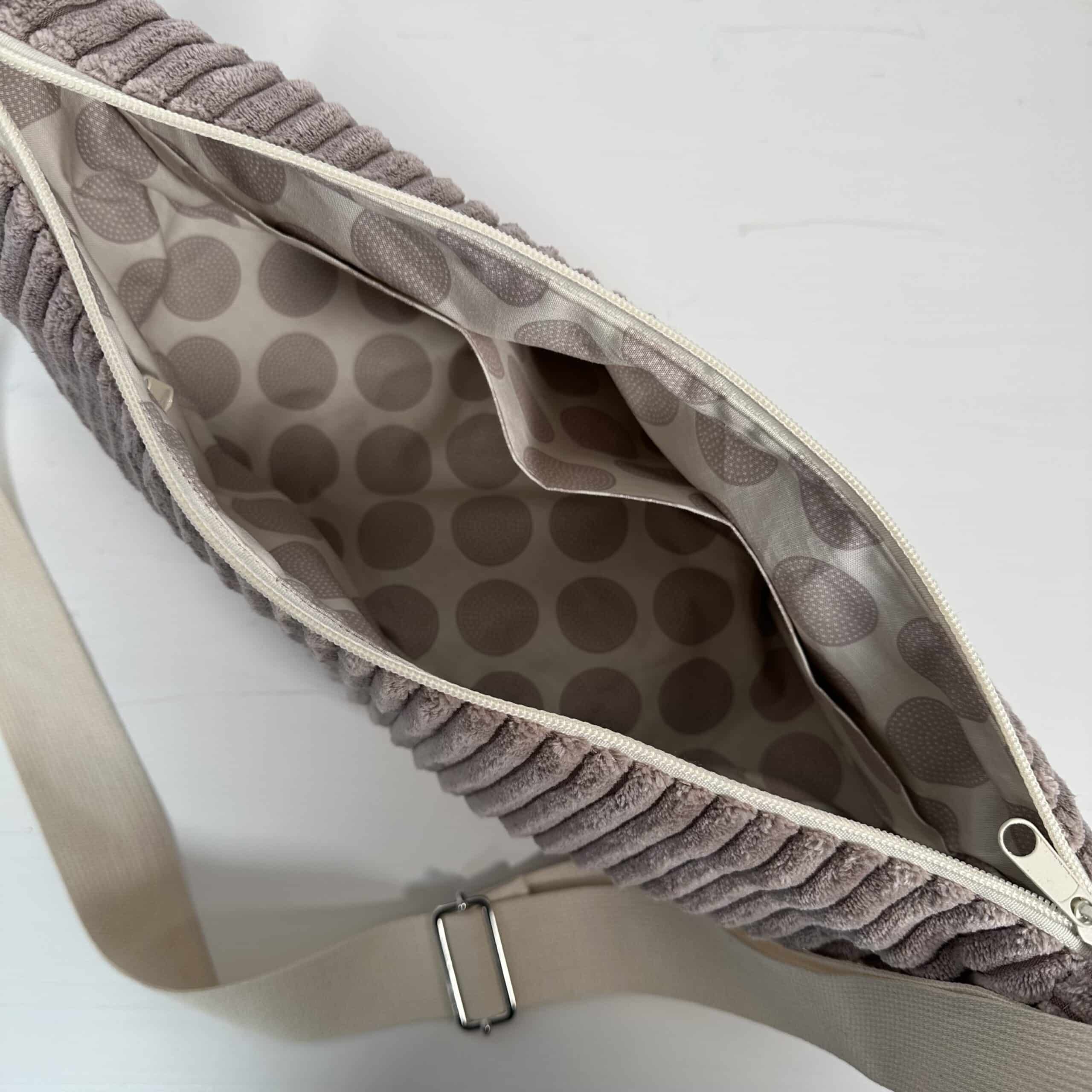 Diese Moon Bag Luna Schultertasche in Größe M wurde nach dem Schnittmuster Moon Bag Luna von creaResa (Lizenznummer 19 12690) sorgfältig und mit viel Liebe genäht. Außen kommt edler Cordstoff Wanja“ in Altrosa (100 % Polyester) zum Einsatz, während das Innenfutter aus Baumwollstoff (100 % Baumwolle) in Altrosa / Creme mit Kreismuster gearbeitet ist.
