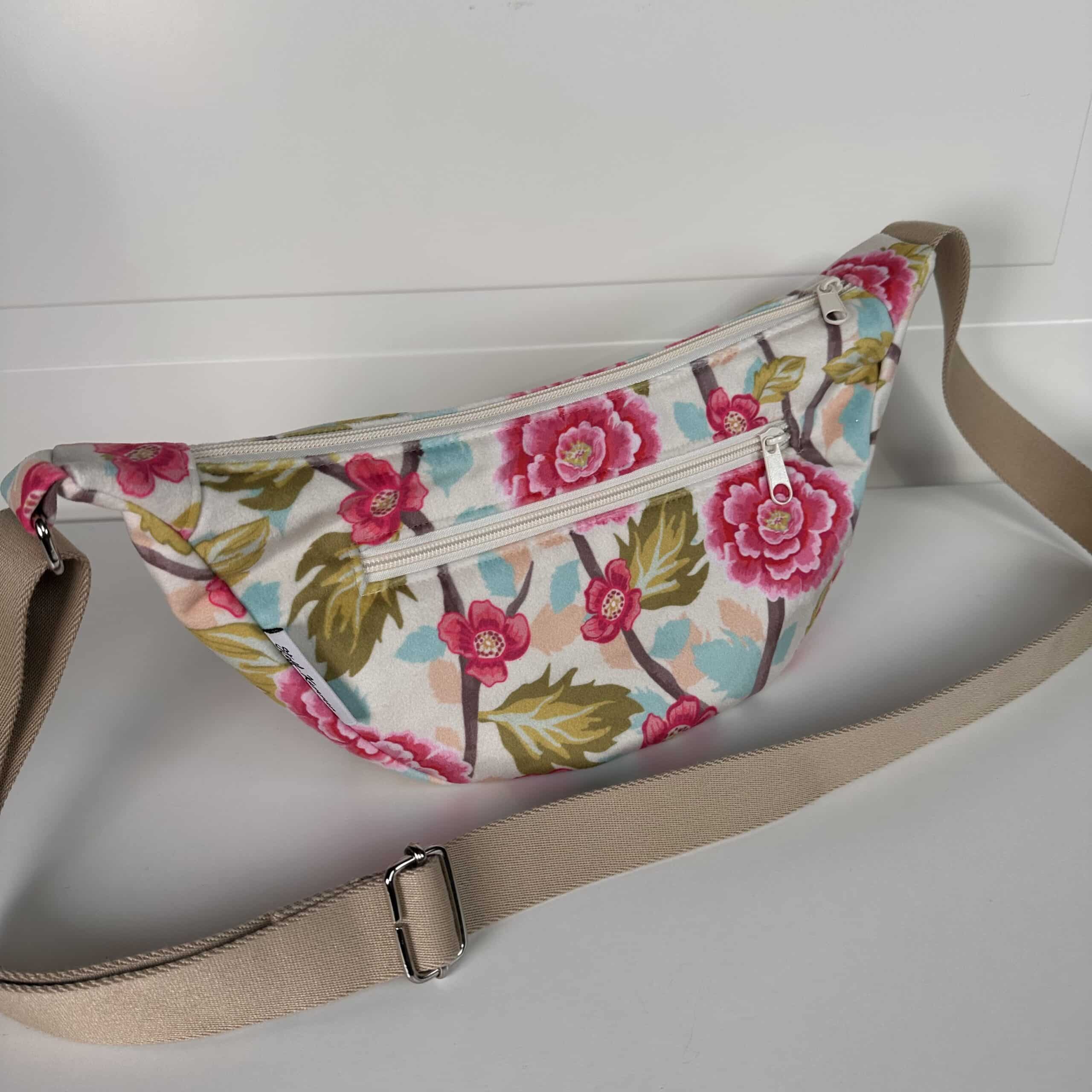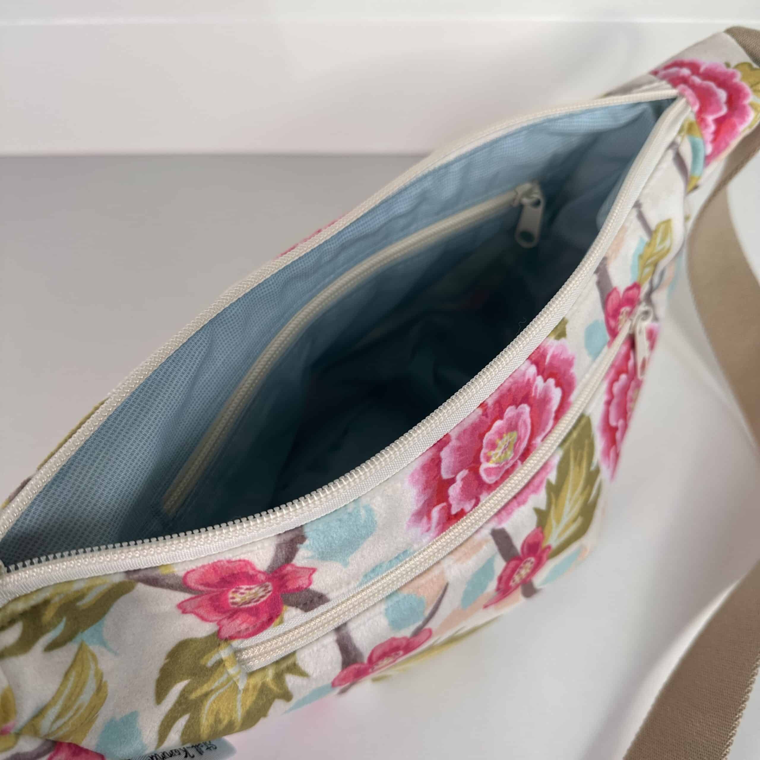 Diese Schultertasche Moon Bag Luna in Größe S wurde nach dem Schnittmuster Moon Bag Luna von creaResa (Lizenznummer 19 12690) sorgfältig und mit viel Liebe genäht. Außen kommt edler Samtstoff Boho Velvet mit Blumenmuster (100 % Polyester) zum Einsatz, während das Innenfutter aus Baumwollstoff (100 % Baumwolle) in hellem Blau gearbeitet ist.
